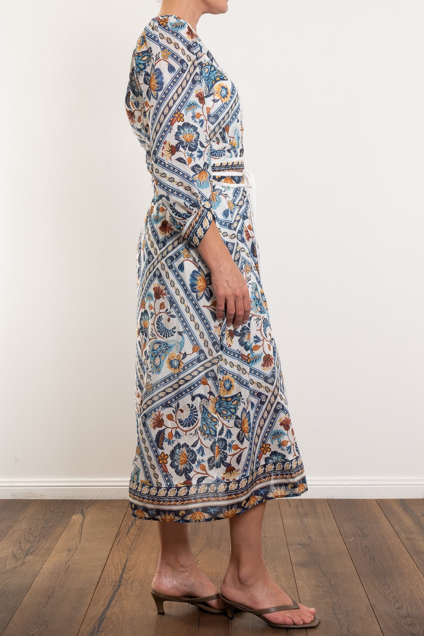 Experience effortless elegance with the Once Was Alexis Contrast Trim Midi Dress. Made from a luxurious silk-cotton blend, it showcases a vibrant floral mosaic in indigo, terracotta, and marigold. The contrast trim and self-tie rope belt highlight your waist, creating a flattering silhouette. Perfect for coastal strolls or garden parties, this dress combines relaxed comfort with sophisticated style.