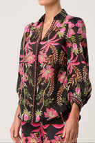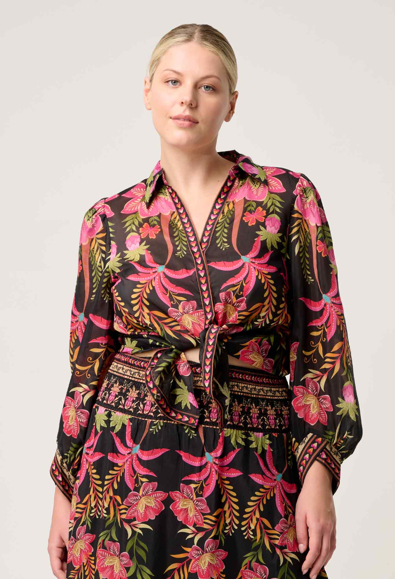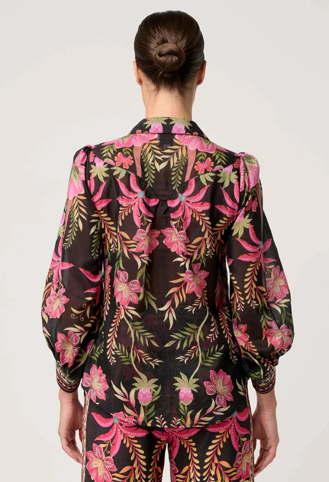 Elevate your style with the Once Was Elysian Cuffed Shirt in Anthos Lótos, crafted from a luxurious silk and cotton blend that feels light and breathable. This shirt features a vibrant floral print in vivid pinks, lush greens, and warm earthy tones, designed to flatter your silhouette. Puff sleeves with elasticated cuffs and a subtly cropped hem create a modern, feminine look with timeless bohemian charm. The softly structured collar and V-neckline are enhanced by a delicate border print along the placket and cuffs, adding elegant detail to this effortlessly sophisticated piece.