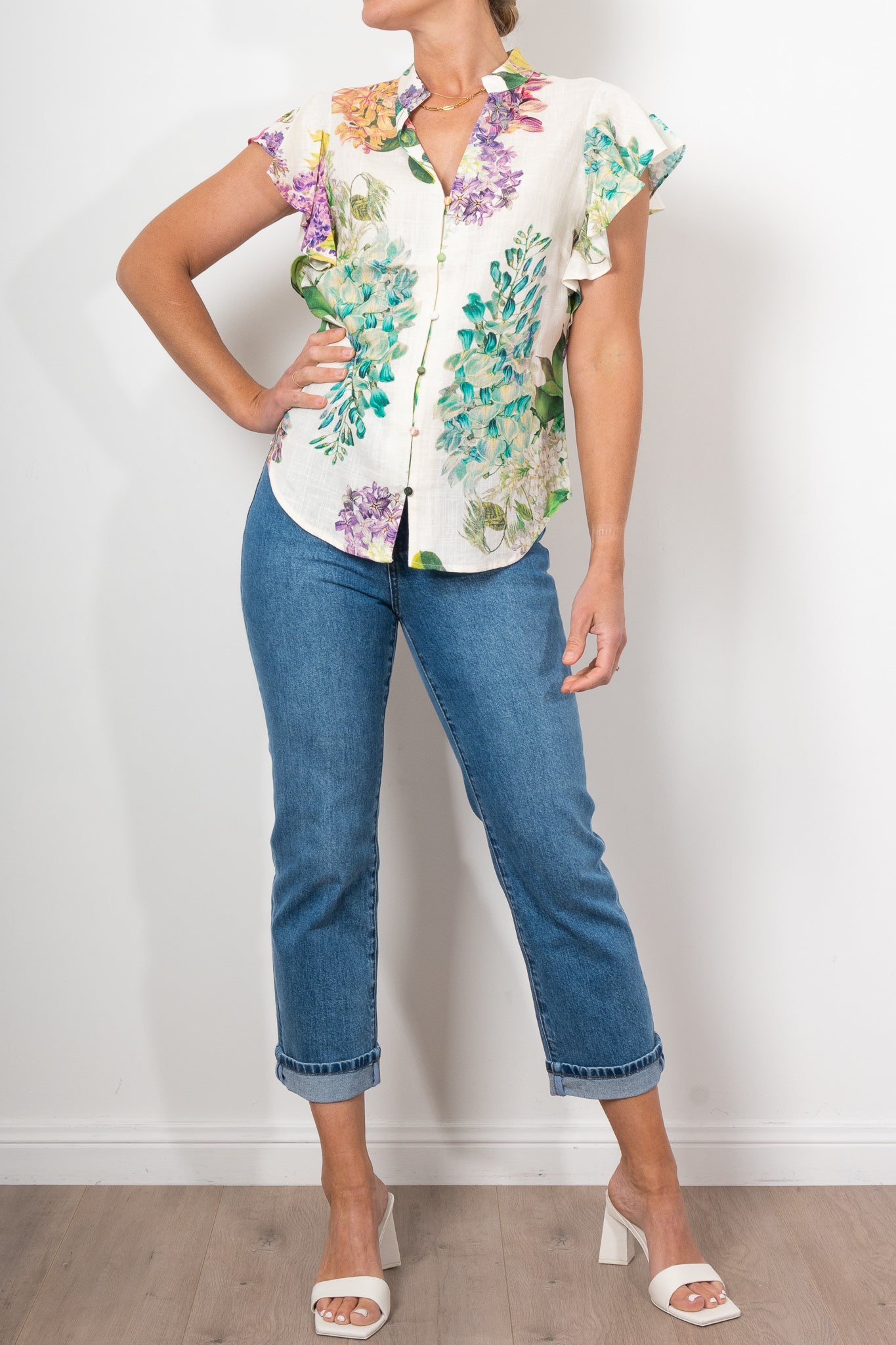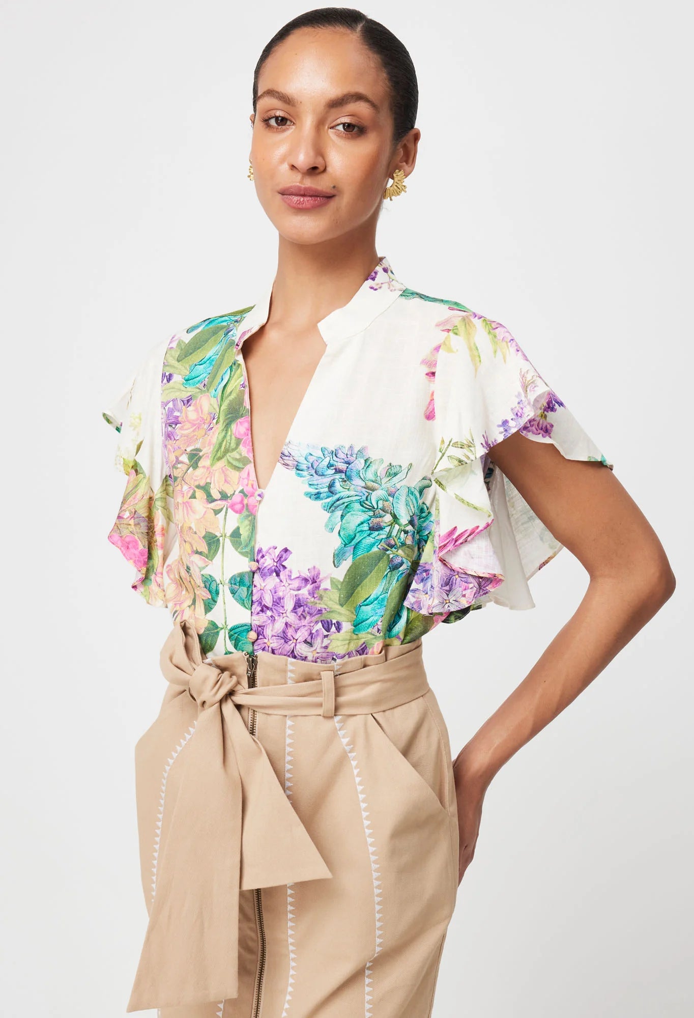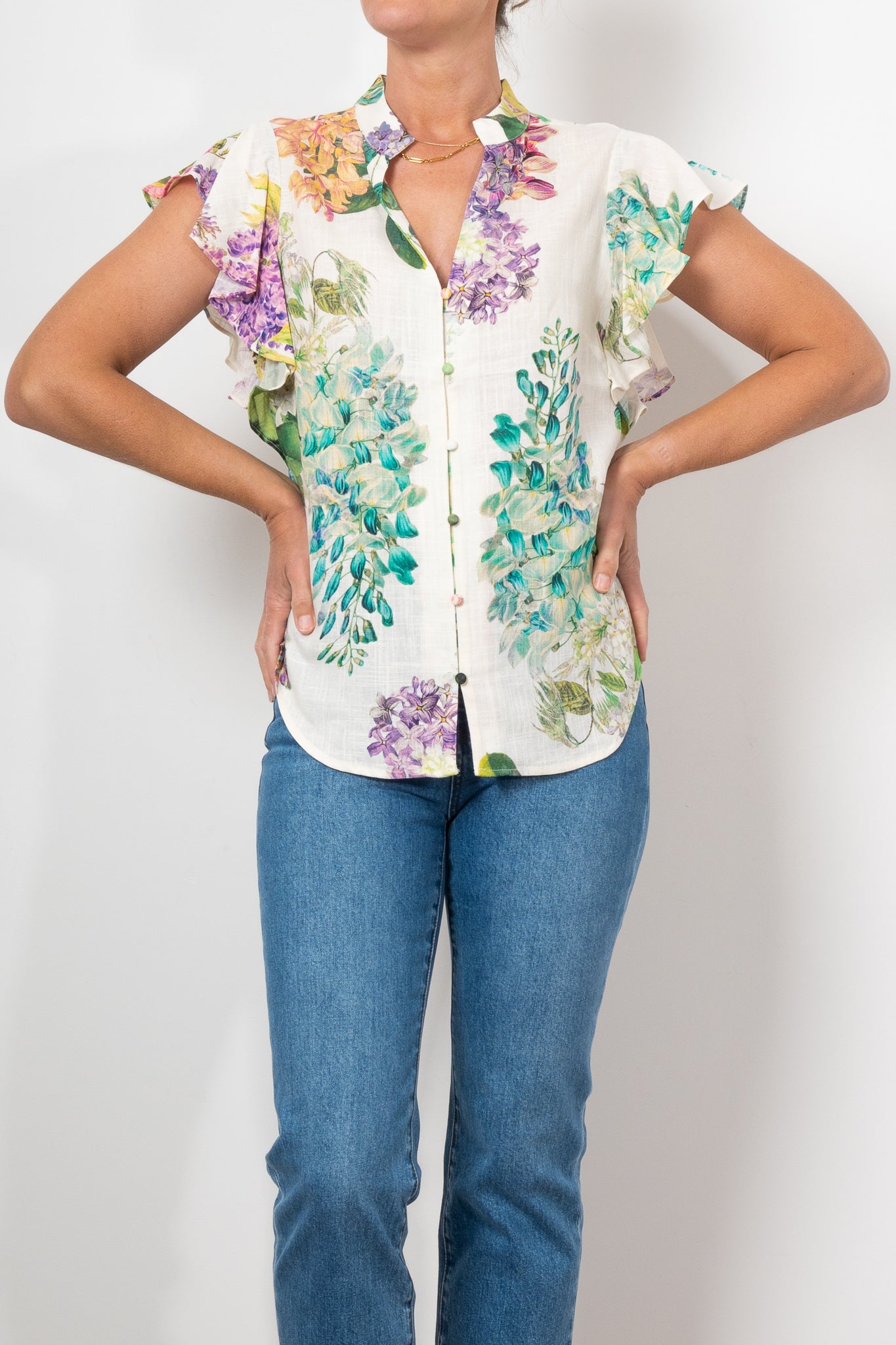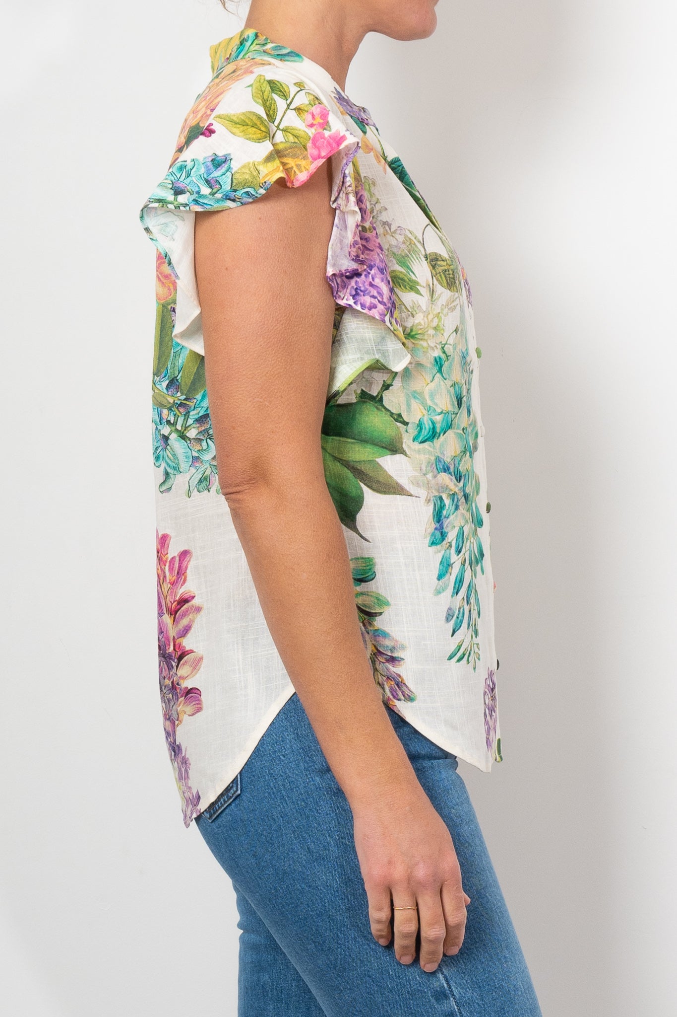 Elevate your everyday style with the Tierra Linen Top in White Wisteria. Featuring a luxurious linen viscose blend and a stunning floral print, this top offers both elegance and comfort. The waterfall flutter sleeves and delicate button loop closure add a touch of romance, while the relaxed fit makes it perfect for any occasion.
