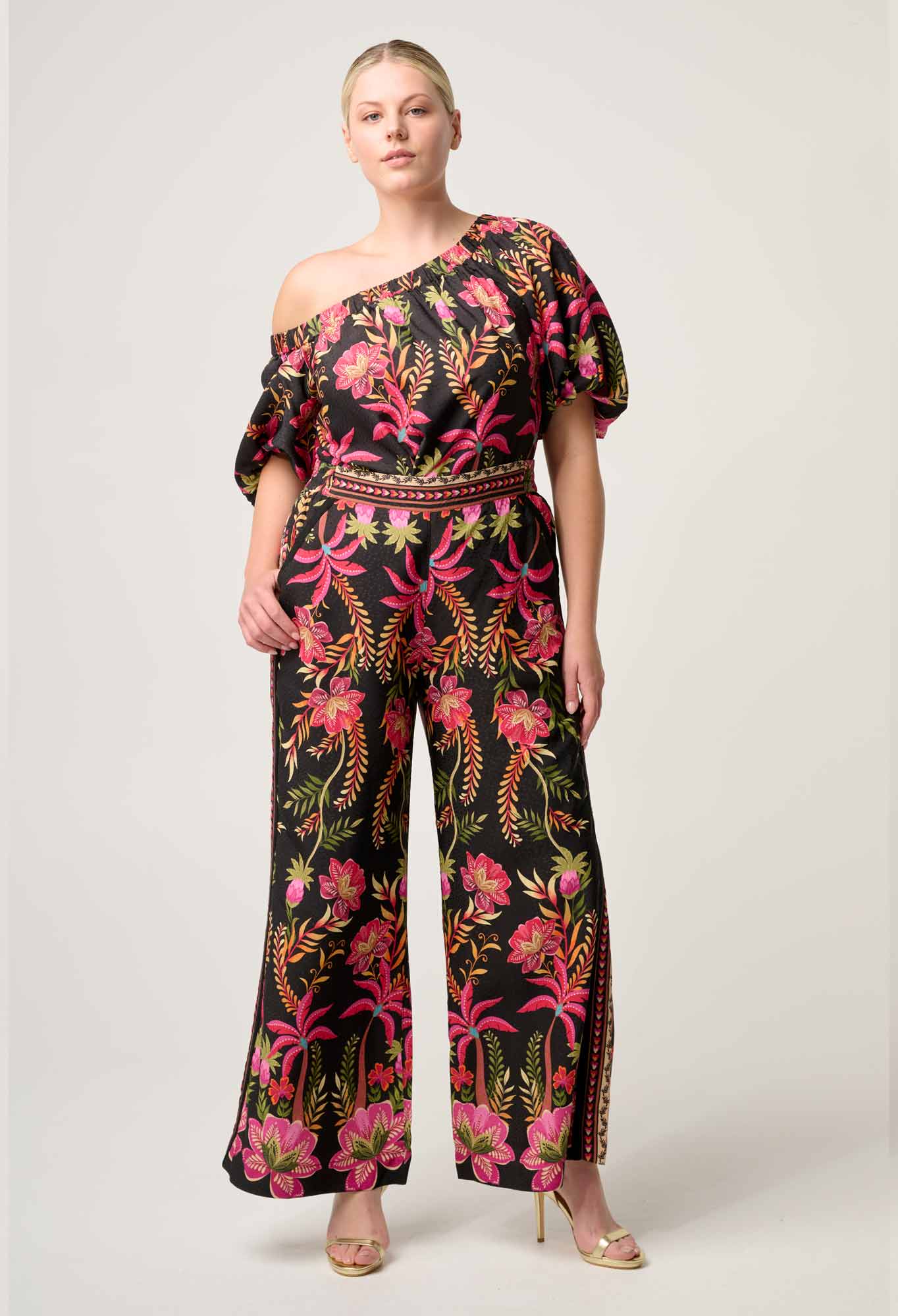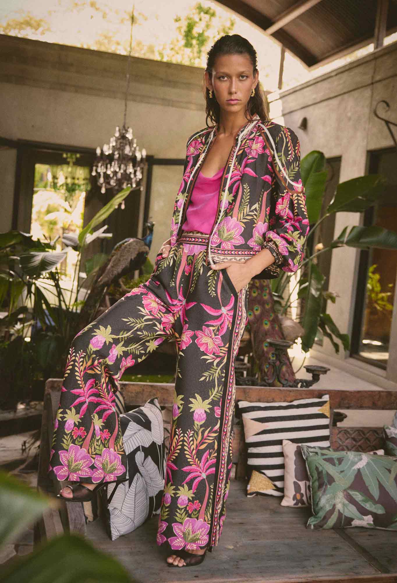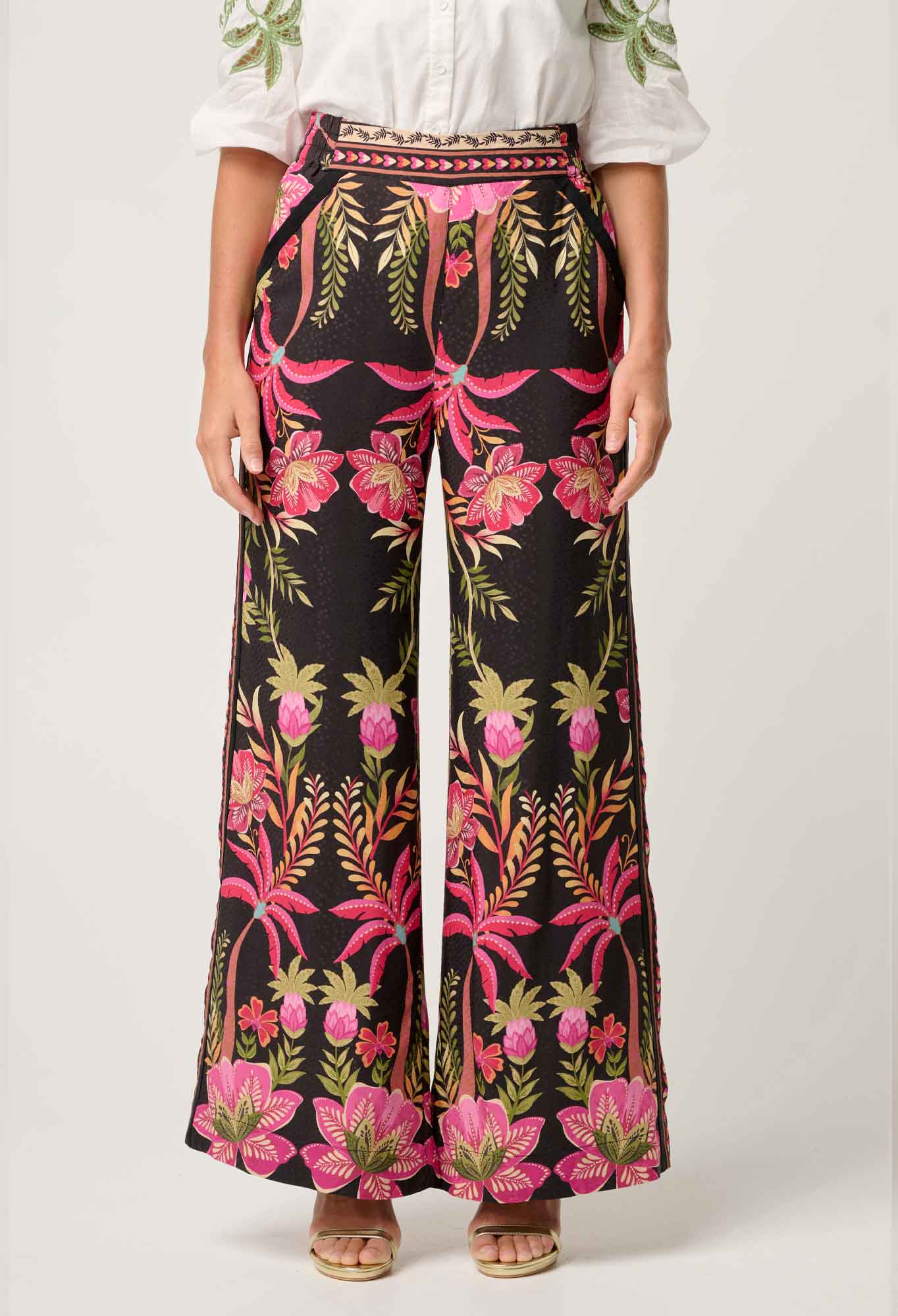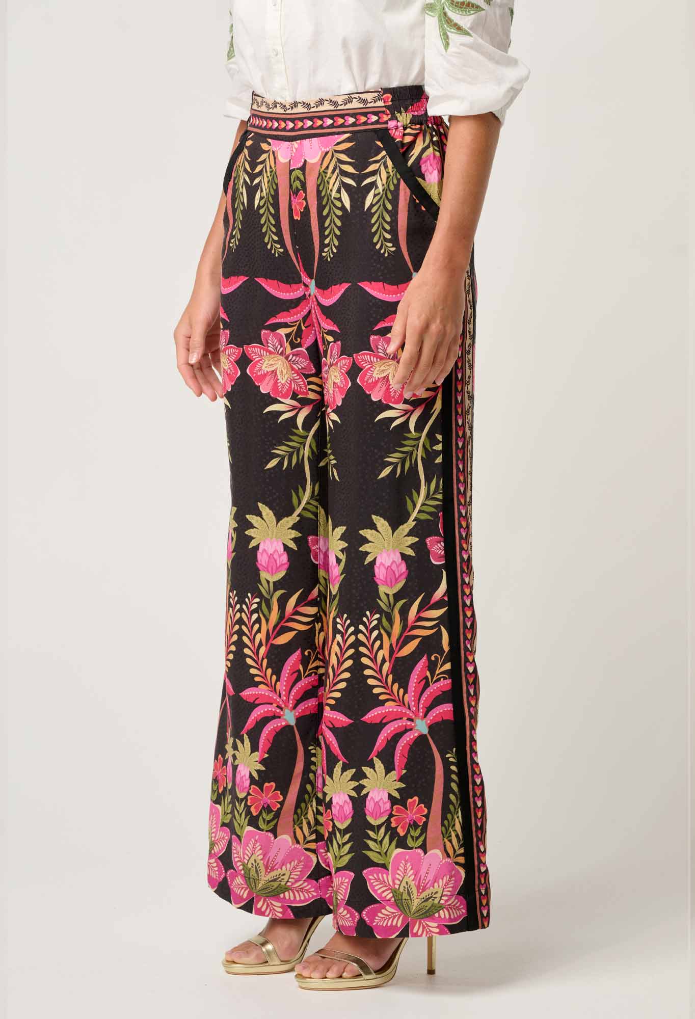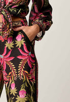 Make a bold and elegant statement with the Once Was Willow Panel Pant in Anthos Lótos. Crafted from lightweight viscose dobby fabric, these wide-leg pants offer breathable comfort and a luxuriously soft feel, perfect for warm weather. The half-elastic waistband ensures a flattering, high-waisted fit that flows into a full-length silhouette. Featuring vibrant tropical florals in pinks, greens, and citrus tones against a deep base, the striking Anthos Lótos print adds dramatic flair. Contrast panel detailing along each leg enhances length and movement, making these pants a standout addition to your wardrobe.