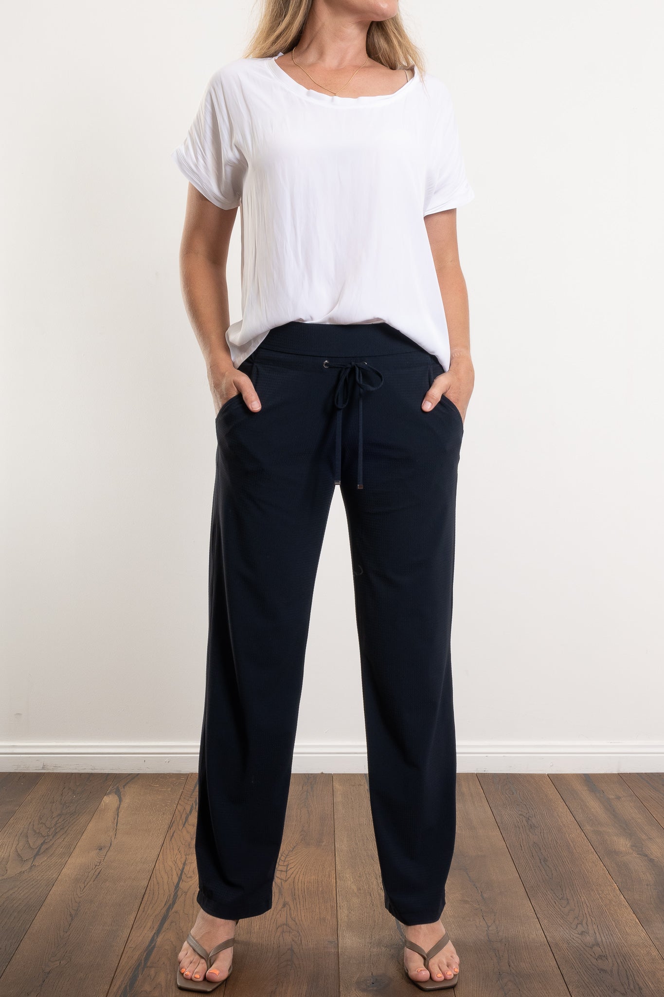 An elevated essential with a sporty soul. The Candice pant offers the ease of a jogger with the polish of a chino—cut in soft, crease-resistant jersey with a subtle all-over minisquare texture for added interest.
