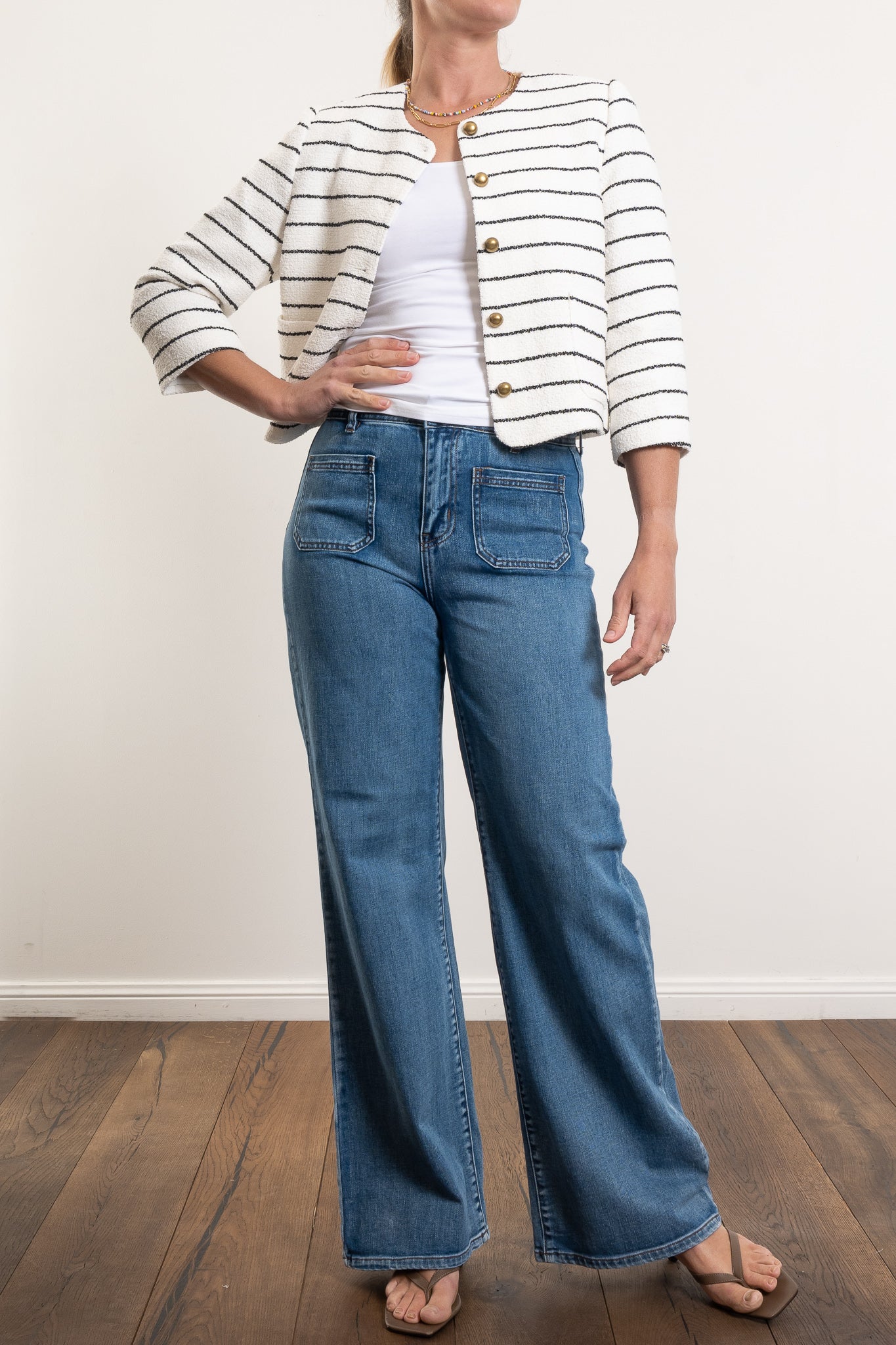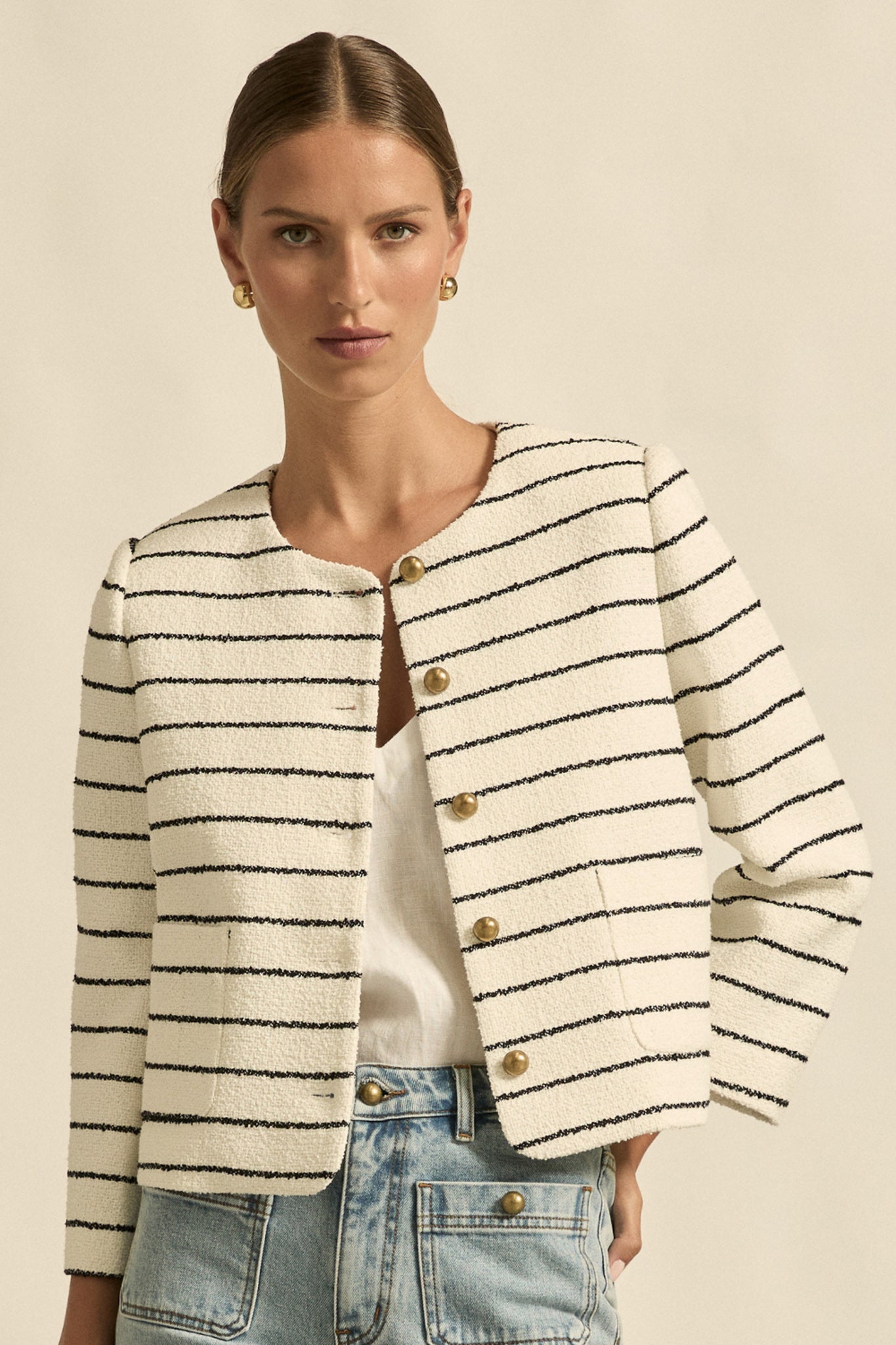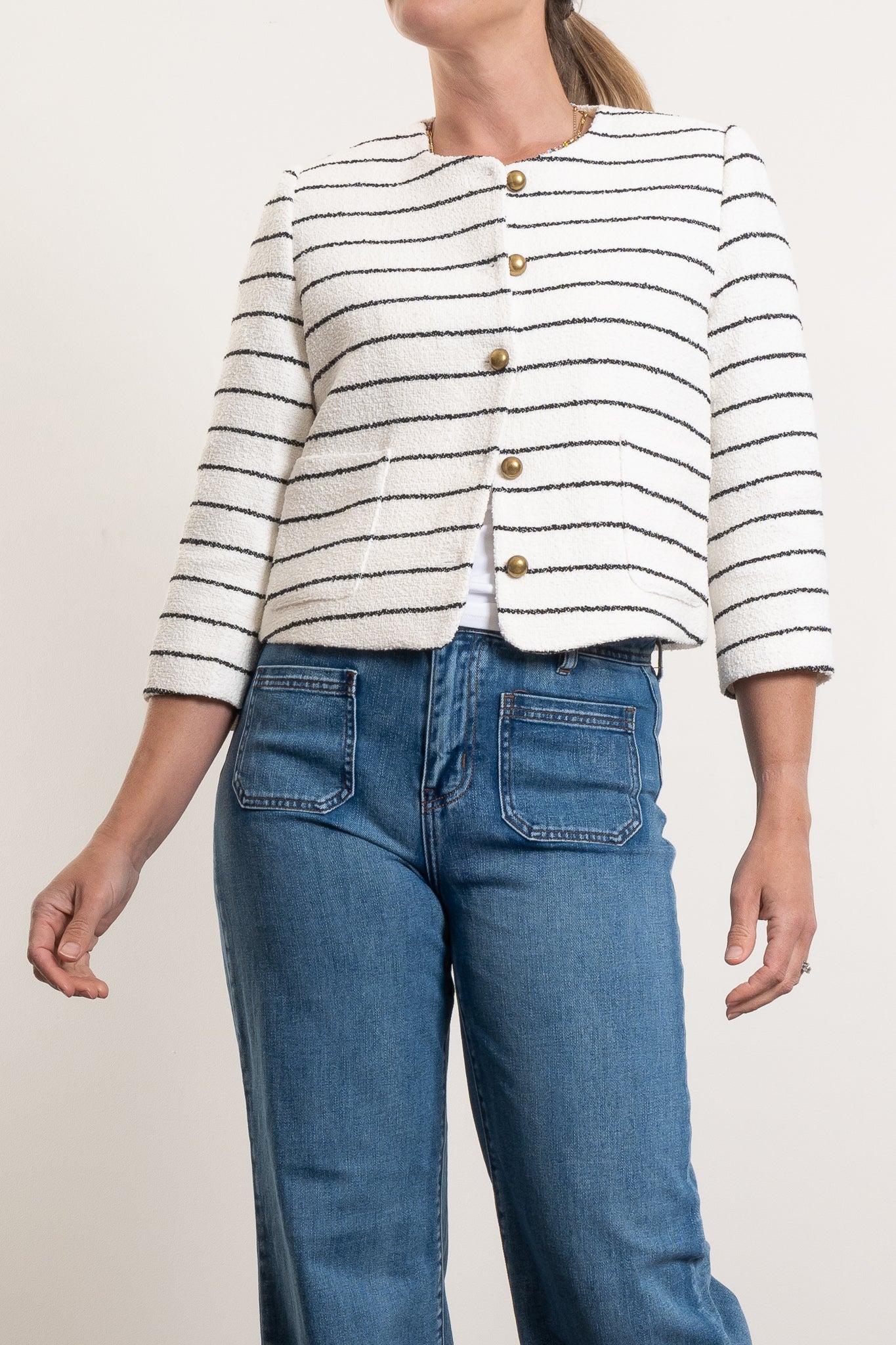 With subtle structure and timeless stripe, the Dash Jacket brings classic French tailoring into a modern context—easy, elegant, and endlessly wearable. See full product description below for fabric and fit info.