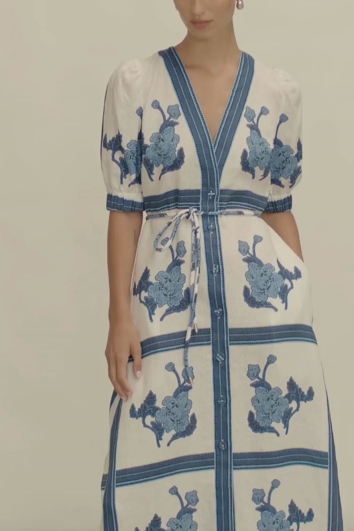 Polished yet relaxed, the Portrait Dress is a timeless addition to your everyday wardrobe. Crafted from pure linen and printed in Zoe Kratzmann’s exclusive Azure Collage design, it combines effortless elegance with flattering structure and subtle detail.