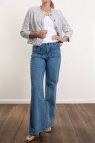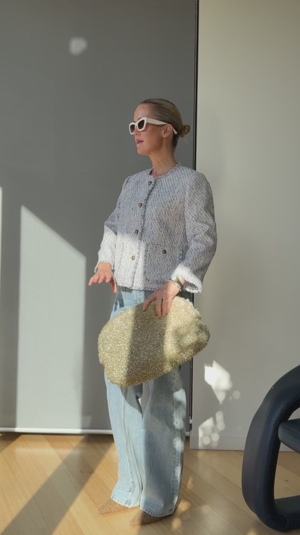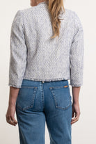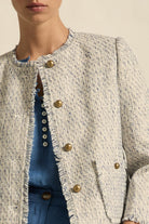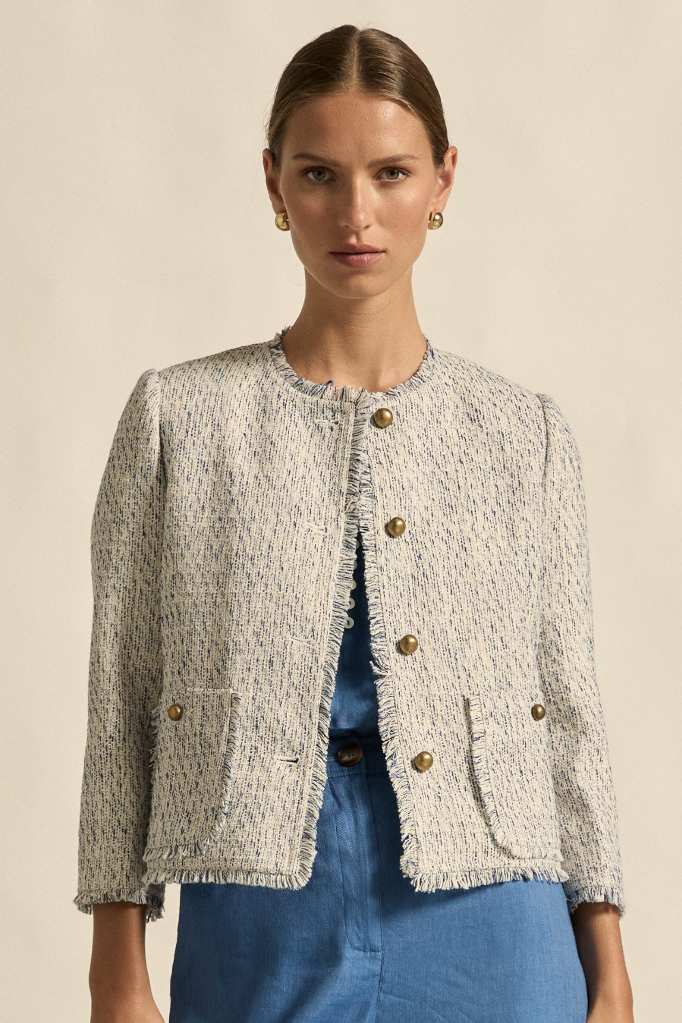 The Zeal Jacket blends elegance with ease, offering a soft take on tailoring that suits both coastal escapes and everyday polish. Woven with subtle blue tones for a rich, textured finish, this cropped jacket features a round neckline, fringed edging, and brushed-brass dome buttons for a modern classic feel.